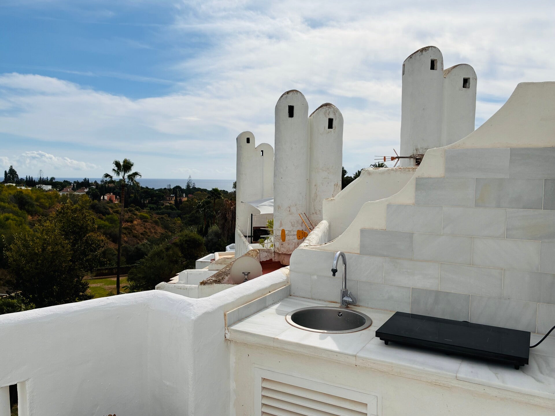 Het dakterras beschikt over een ruime zitbank met eettafel en stoelen (max 8 personen), 2 ligbedden, zitbank, buitendouche, berging met wasmachine, droogkast, koelkast, vaatwasser en koffiezet. Koken kan op de barbecue of op het inductievuur buiten aan te sluiten naast de spoelbak. Koken met zicht op zee 😍